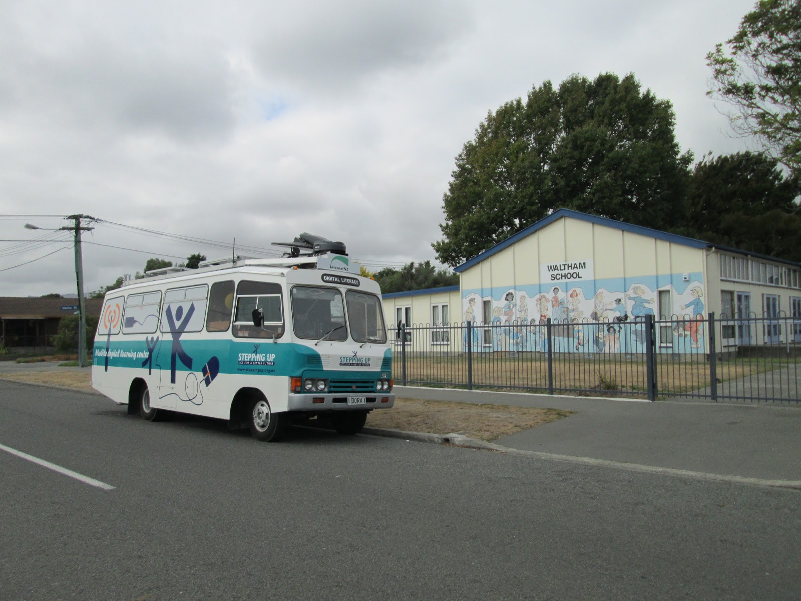 On Monday 30 September, DORA visited the Positive Aging Expo at Papanui High School, along with the Christchurch City Council library van. Many visitors came on board to enquire what programmes are run on DORA; to explore the library website, or to just have a look. DORA always stands out from the crowd - her satellite dish, solar panels and connectivity intrigue people. Volunteer, Janet De Lu, kindly helped out on board.